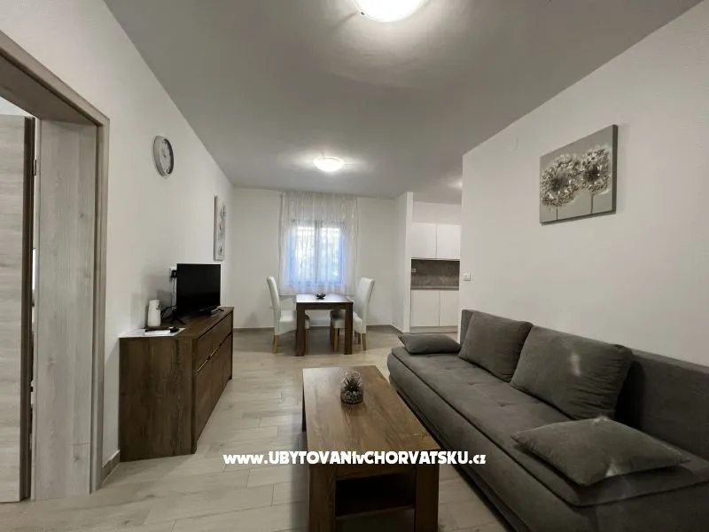 Apartament Bougainvillea składa się z salonu, jadalni, kuchni, łazienki i tarasu, może pomieścić 4 osoby. Znajduje się 200 m od morza (od nabrzeża) i 500 m od piaszczystej plaży Bijeca.