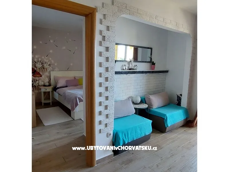 Ten klimatyzowany apartament na parterze 2 + 2.Velika taras z częściowym widokiem na morze, w naturalnym odcieniu sypialni loze.1x winogron, łazienki, kuchni (2018), mając na rasklapanje.Inte.Wi-FI. TV Sat, parking