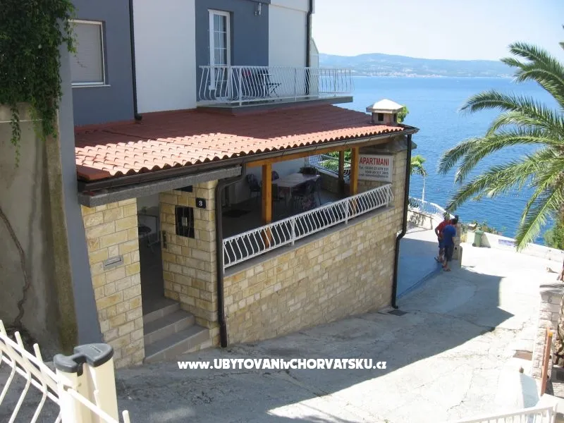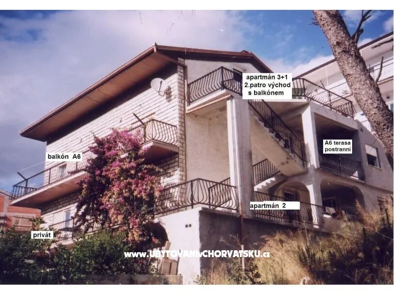 Willa posiada w sumie 6 apartamentów: 3x 2 łóżek, 2x 2+2 łóżek, 1x 6 łóżek. Apartament z 6 łóżkami jest luksusowy apartament na całym pierwszym piętrze. Składa się z: 3 sypialnie 2 +2 +2, kuchnie, 2 łazienki / WC. Z każdej sypialni znajdują się drzwi na balkon z pięknym widokiem na morze, taras stronie. Cztery apartamenty na drugim piętrze na poddaszu